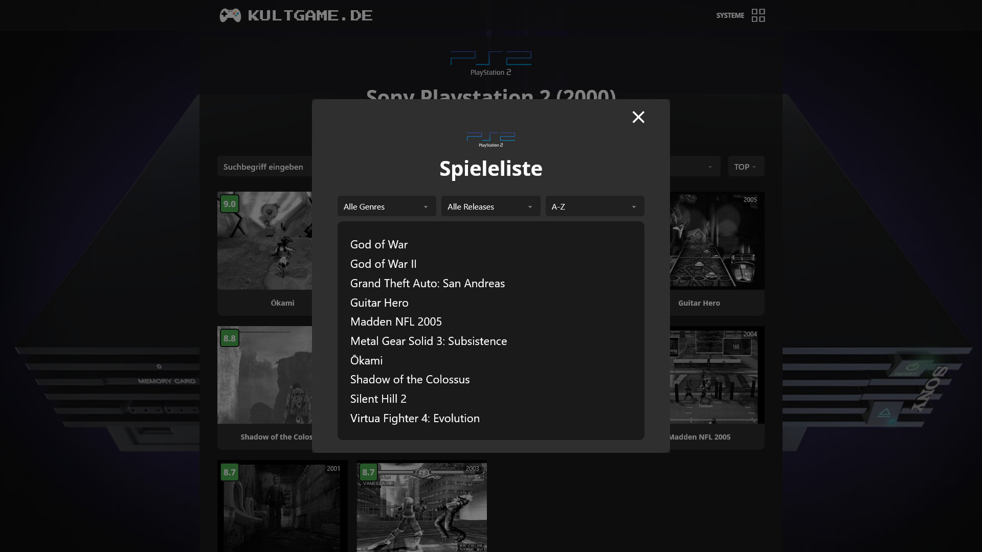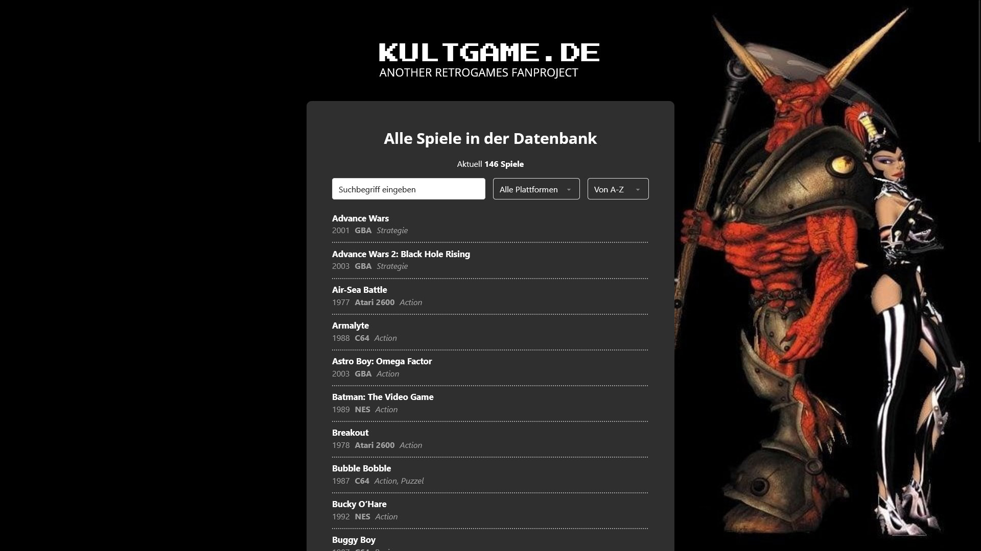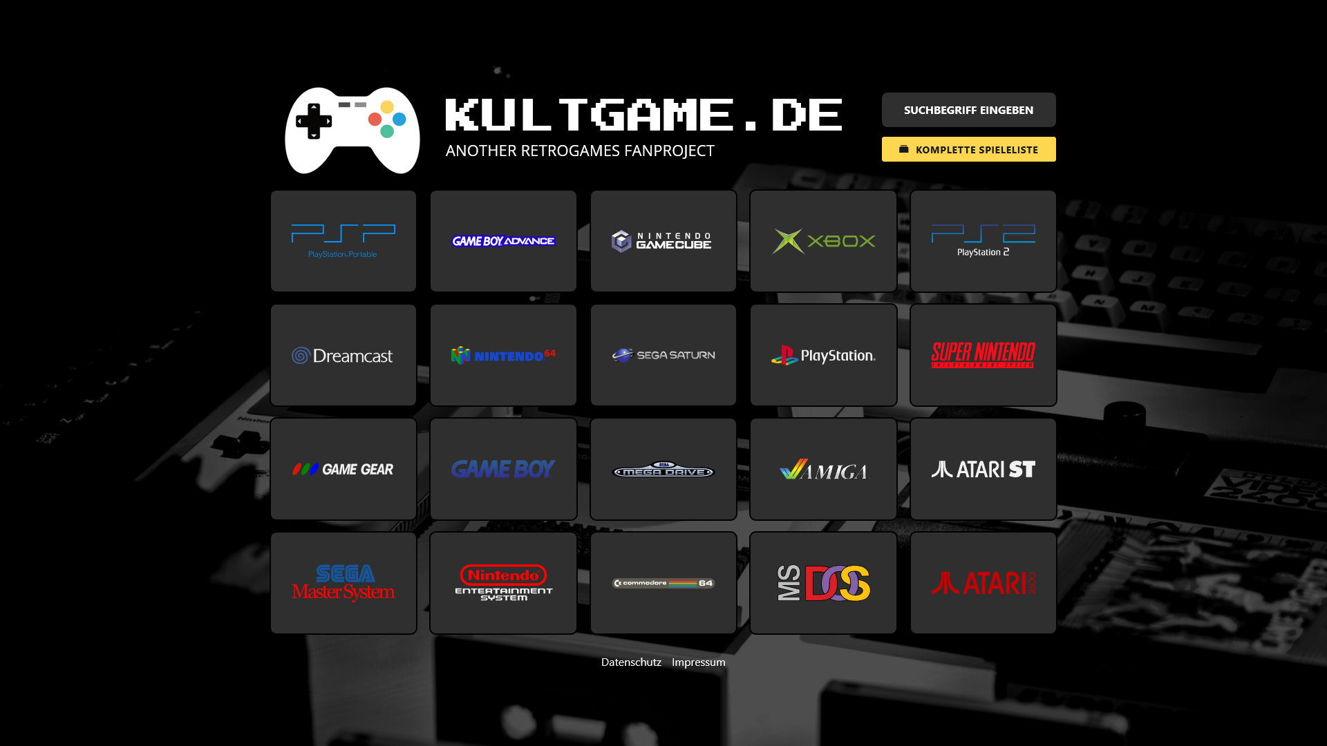 Kultgame.de ist eine Webseite mit Top 100 Auflistungen alter Spieleklassiker der jeweiligen Konsolen und Computergenerationen von den Anfängen bis ca 2010. Reines Fan-Projekt.